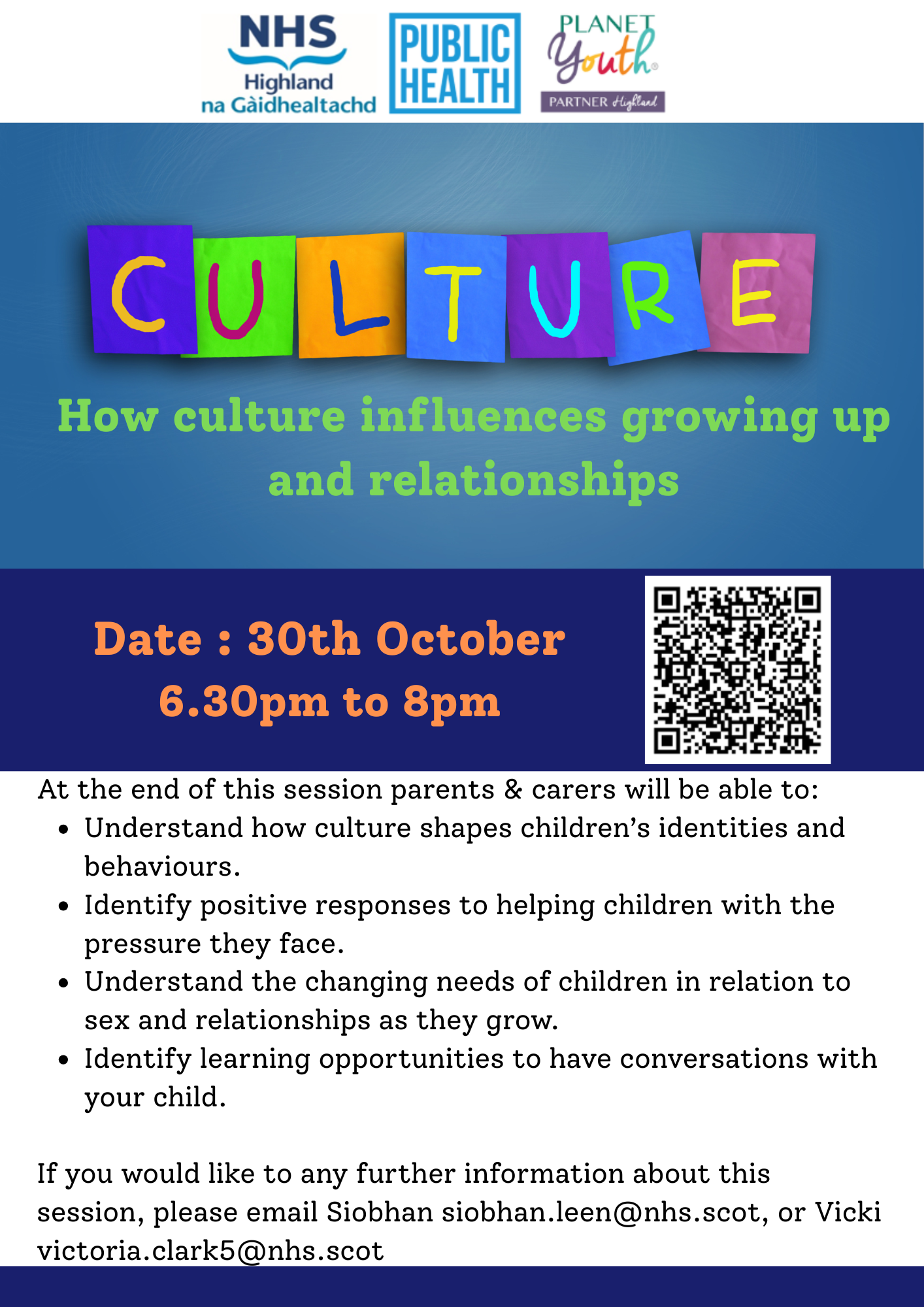 We'd love to see you at our first session on Thursday 30th October - this week's session is looking at how Culture influences growing up and relationships - useful for all parents!